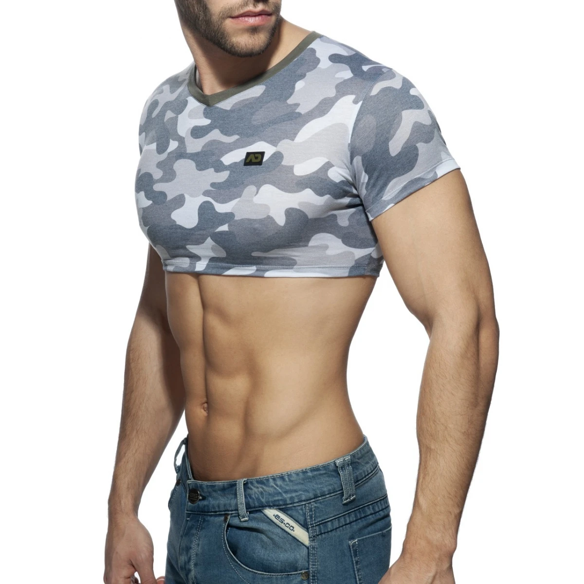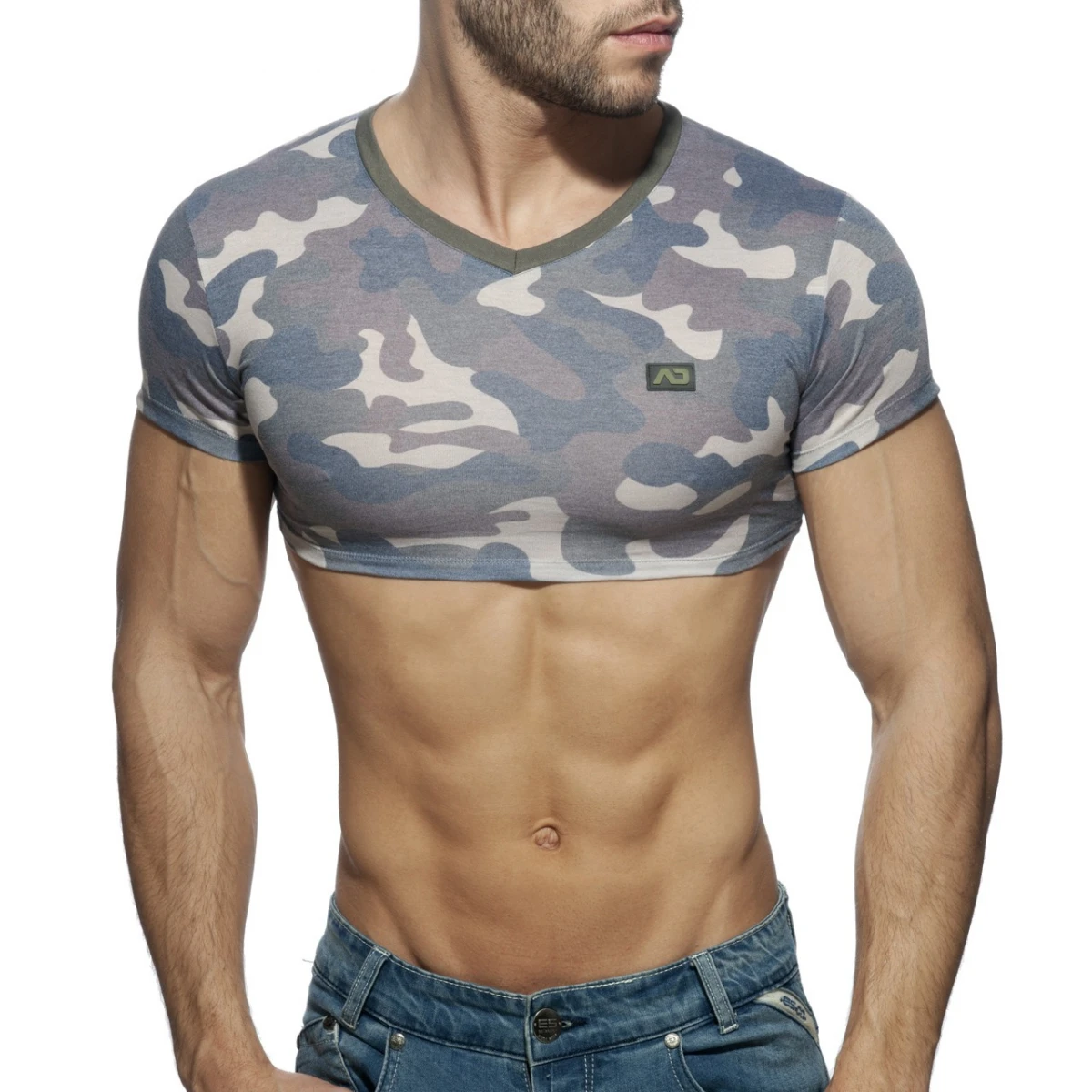 V-neck t-shirt 50% polyester 50% viscose Contrasting lines Washed camouflage print AD silicone logo on the front side Soft and light Designed & made in Barcelona